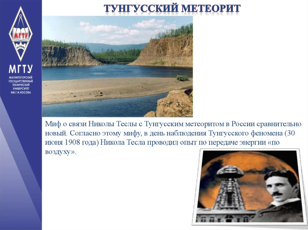Миф о связи Николы Теслы с Тунгусским метеоритом в России сравнительноновый. Согласно этому мифу, в день наблюдения Тунгусского феномена (30