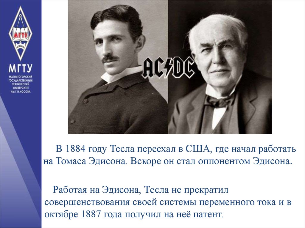 В 1884 году Тесла переехал в США, где начал работатьна Томаса Эдисона. Вскоре он стал оппонентом Эдисона.