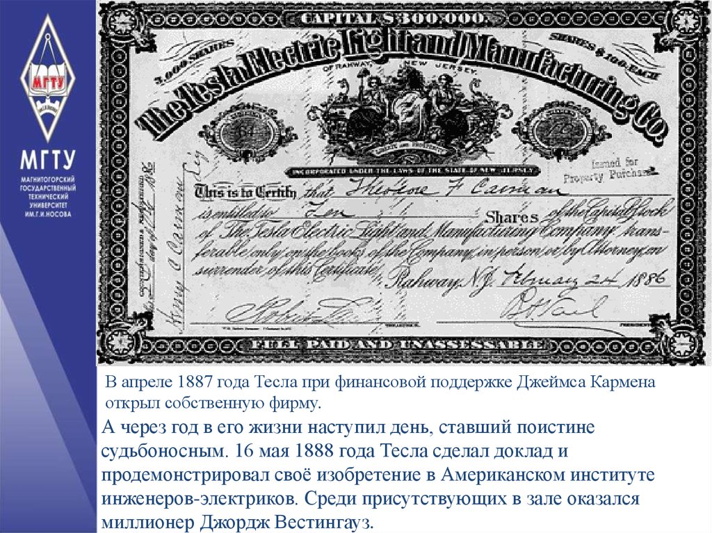 В апреле 1887 года Тесла при финансовой поддержке Джеймса Карменаоткрыл собственную фирму.