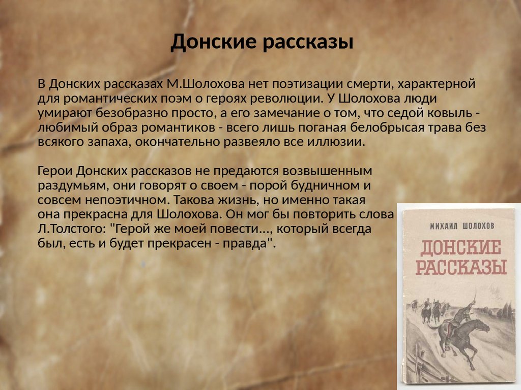 Донские рассказыВ Донских рассказах М.Шолохова нет поэтизации смерти, характерной