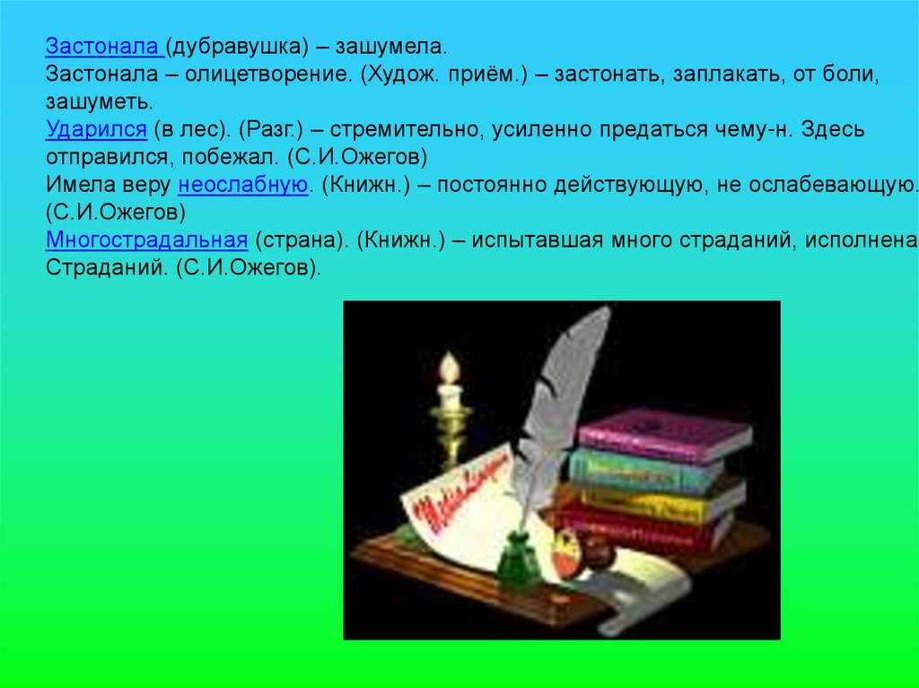 Застонала (дубравушка) – зашумела.Застонала – олицетворение. (Худож. приём.) – застонать, заплакать, от боли,