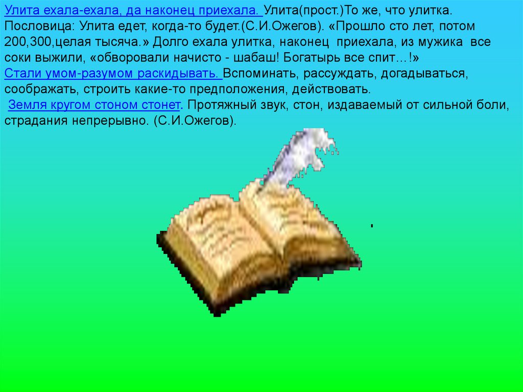 Улита ехала-ехала, да наконец приехала. Улита(прост.)То же, что улитка.Пословица: Улита едет, когда-то будет.(С.И.Ожегов). «Прошло сто лет, потом