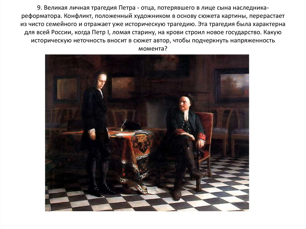 9. Великая личная трагедия Петра - отца, потерявшего в лице сына наследникареформатора. Конфликт, положенный художником в основу сюжета картины, перерастаетиз чисто семейного и отражает уже историческую трагедию. Эта трагедия была характерна