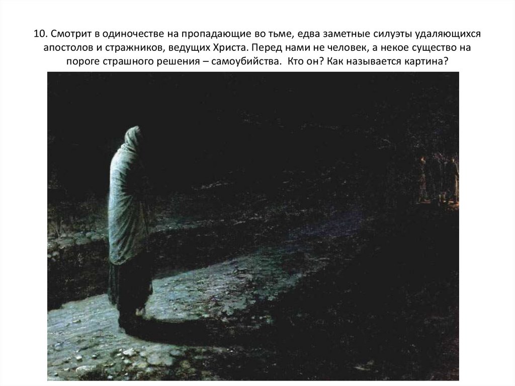 10. Смотрит в одиночестве на пропадающие во тьме, едва заметные силуэты удаляющихсяапостолов и стражников, ведущих Христа. Перед нами не человек, а некое существо на