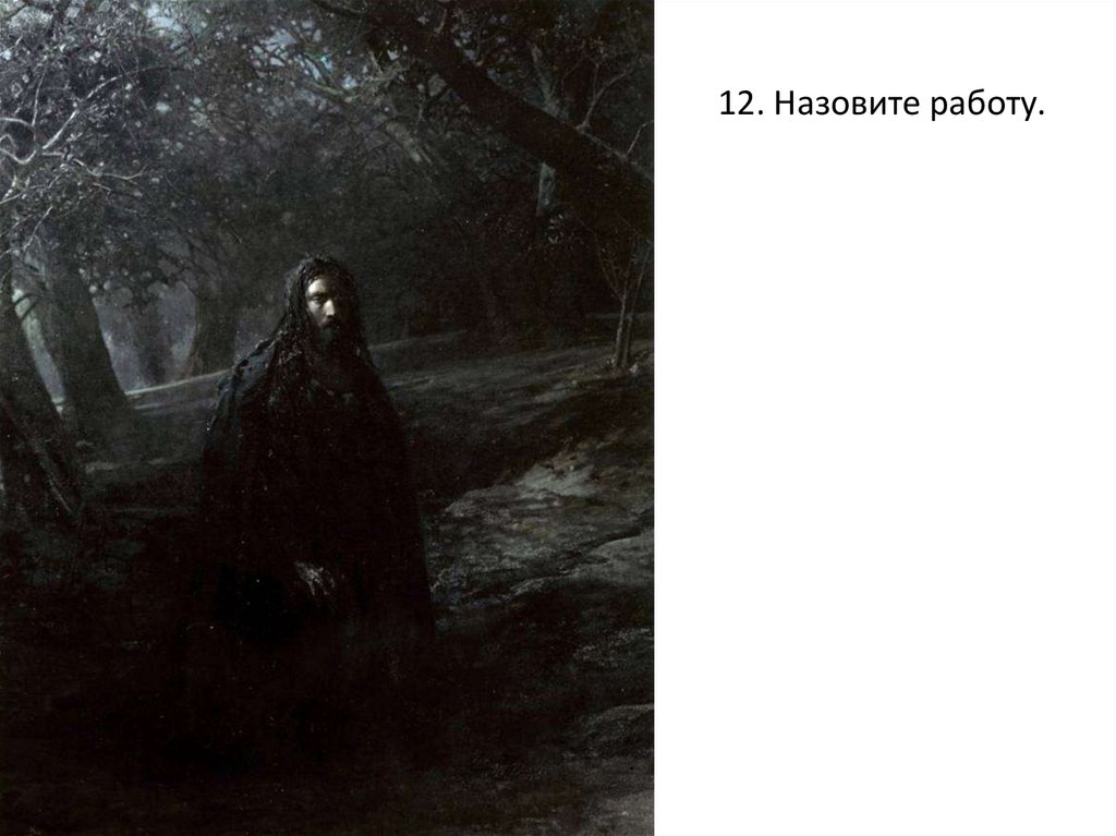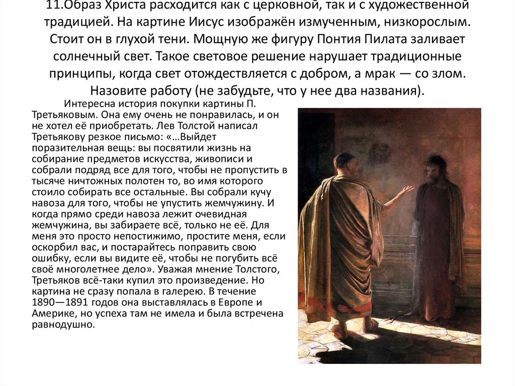 11.Образ Христа расходится как с церковной, так и с художественнойтрадицией. На картине Иисус изображён измученным, низкорослым.