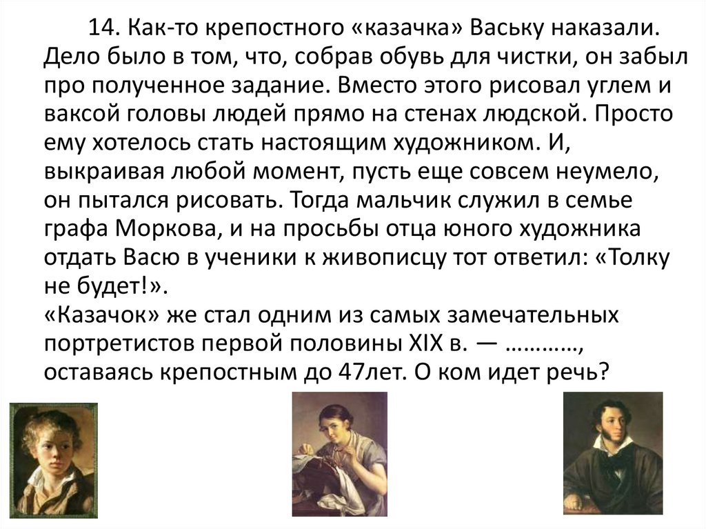 14. Как-то крепостного «казачка» Ваську наказали.Дело было в том, что, собрав обувь для чистки, он забыл