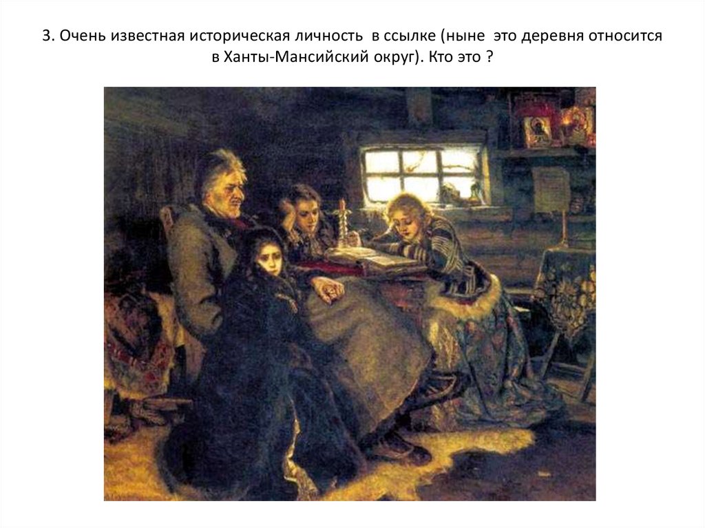 3. Очень известная историческая личность в ссылке (ныне это деревня относитсяв Ханты-Мансийский округ). Кто это ?