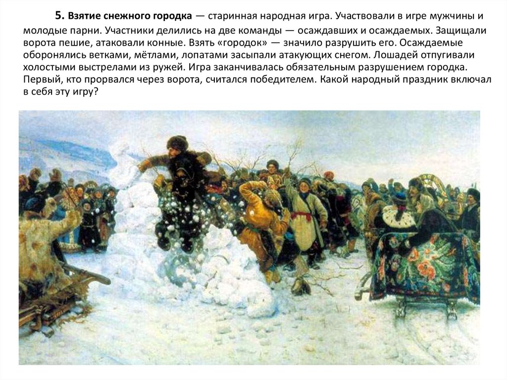 5. Взятие снежного городка — старинная народная игра. Участвовали в игре мужчины имолодые парни. Участники делились на две команды — осаждавших и осаждаемых. Защищали