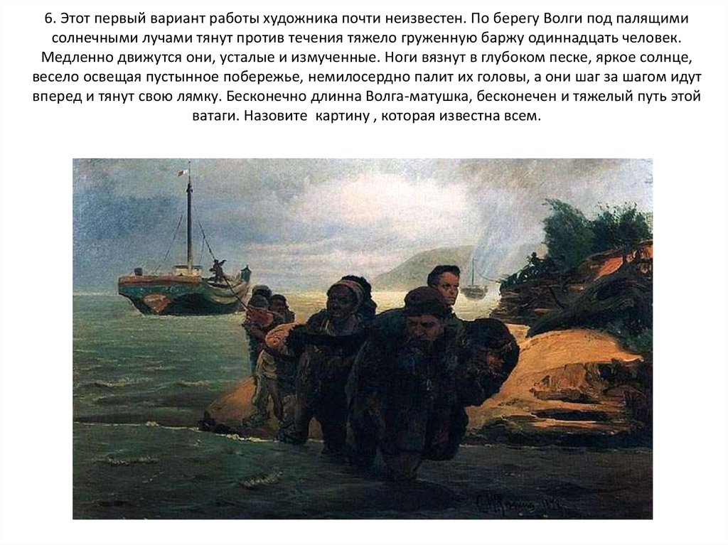 6. Этот первый вариант работы художника почти неизвестен. По берегу Волги под палящимисолнечными лучами тянут против течения тяжело груженную баржу одиннадцать человек.