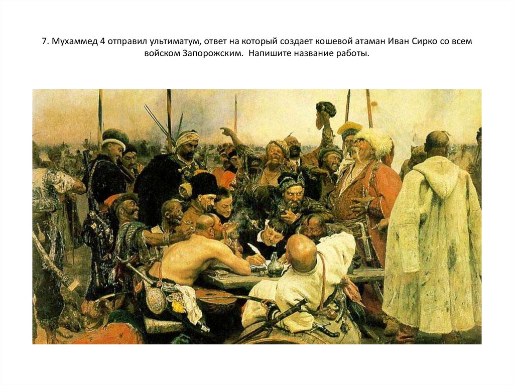 7. Мухаммед 4 отправил ультиматум, ответ на который создает кошевой атаман Иван Сирко со всемвойском Запорожским. Напишите название работы.
