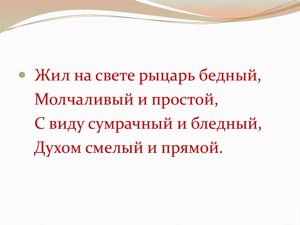 Жил на свете рыцарь бедный,Молчаливый и простой,