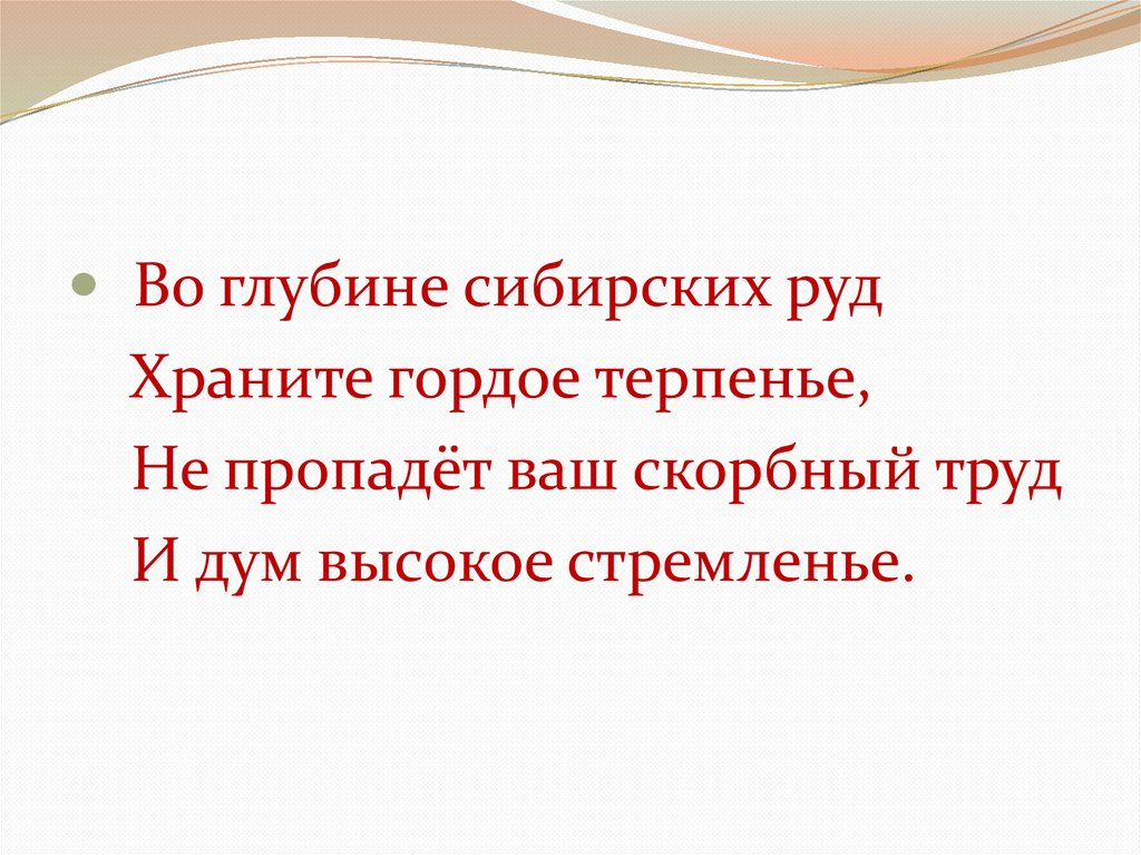 Во глубине сибирских рудХраните гордое терпенье,