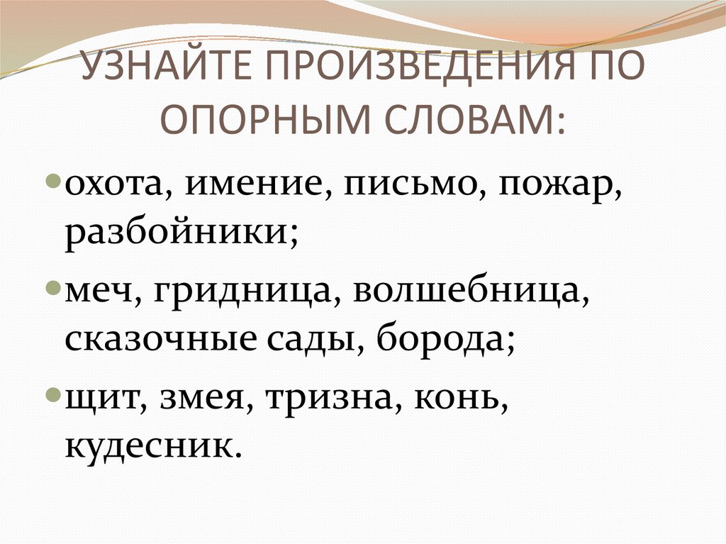 УЗНАЙТЕ ПРОИЗВЕДЕНИЯ ПООПОРНЫМ СЛОВАМ: