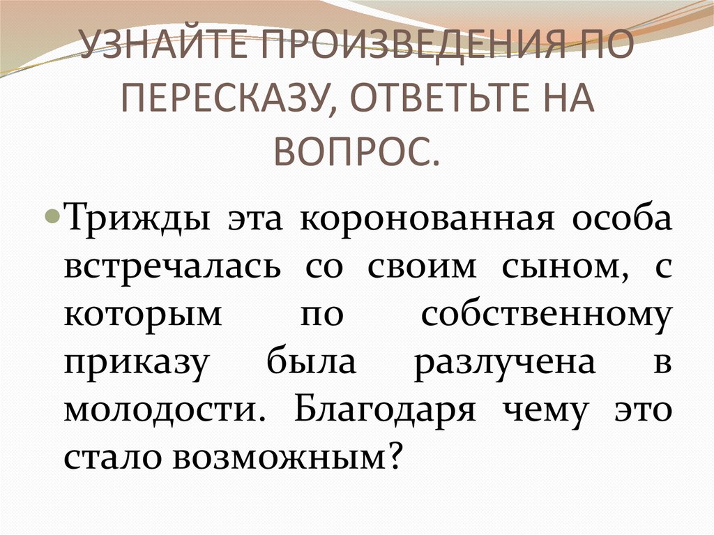 УЗНАЙТЕ ПРОИЗВЕДЕНИЯ ПОПЕРЕСКАЗУ, ОТВЕТЬТЕ НА