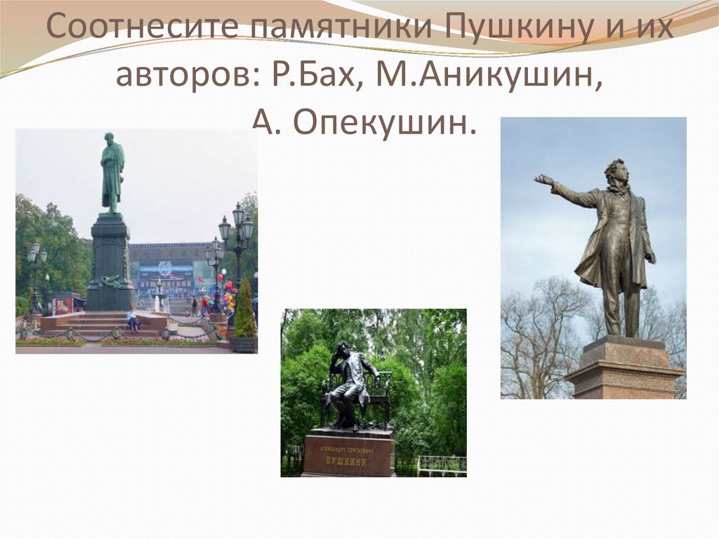 Соотнесите памятники Пушкину и ихавторов: Р.Бах, М.Аникушин,