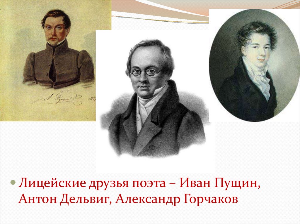Лицейские друзья поэта – Иван Пущин,Антон Дельвиг, Александр Горчаков