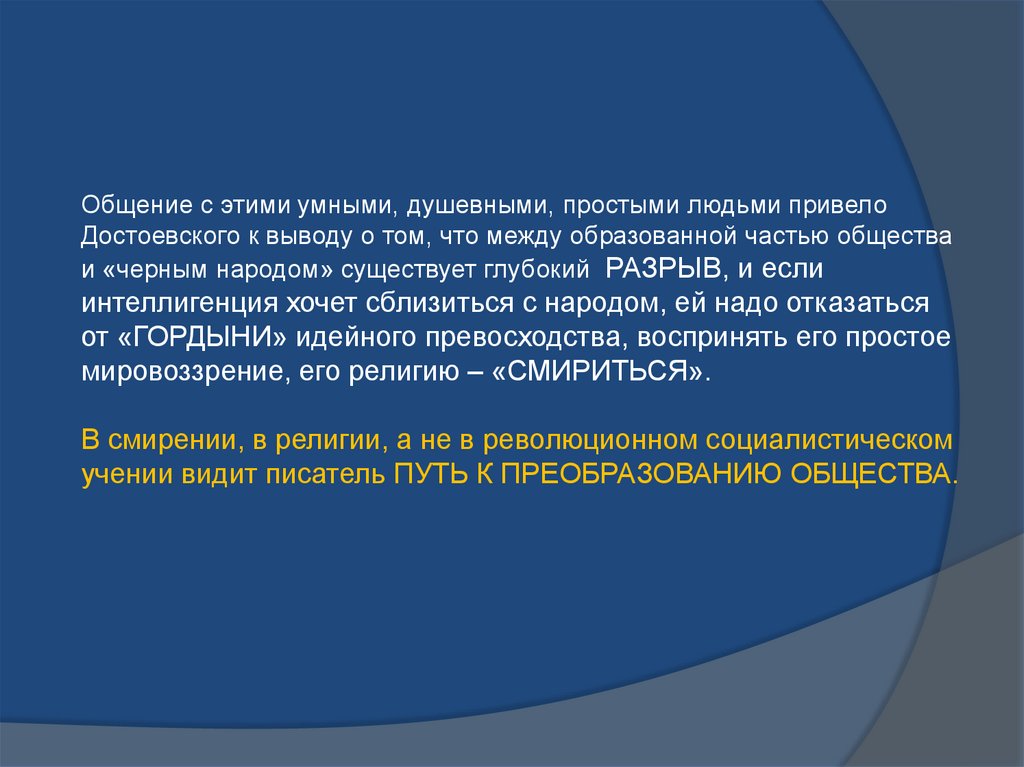 Общение с этими умными, душевными, простыми людьми привелоДостоевского к выводу о том, что между образованной частью общества