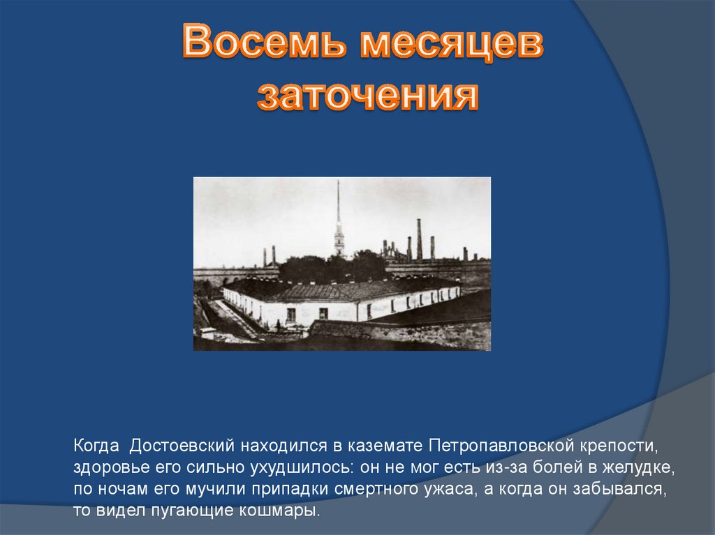 Когда Достоевский находился в каземате Петропавловской крепости,здоровье его сильно ухудшилось: он не мог есть из-за болей в желудке,