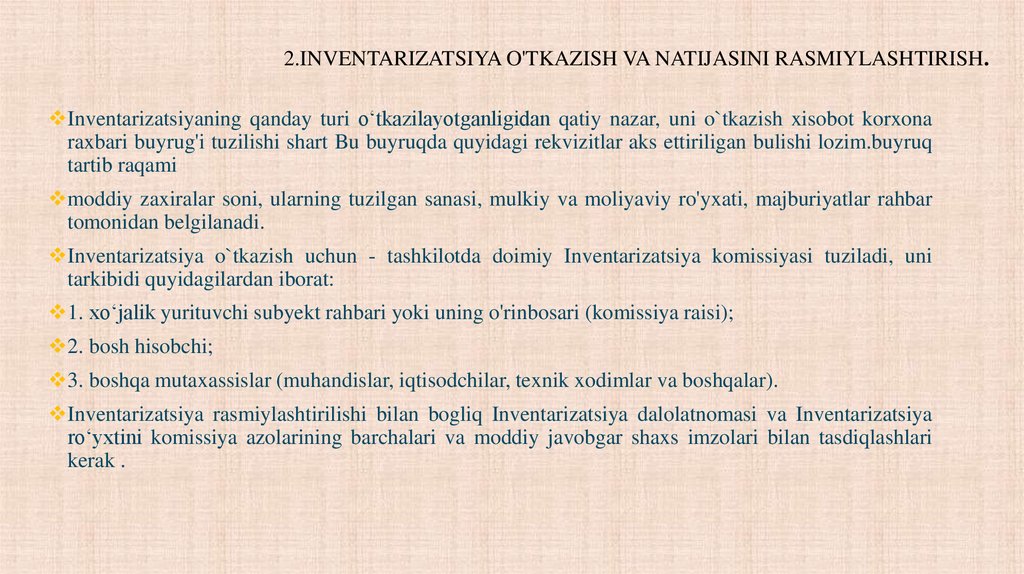 • 2. Inventarizatsiya o'tkazish va natijasini rasmiylashtirish.