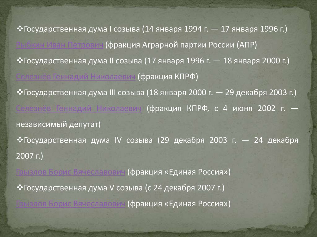 Государственная дума I созыва (14 января 1994 г. — 17 января 1996 г.)Рыбкин Иван Петрович (фракция Аграрной партии России (АПР)