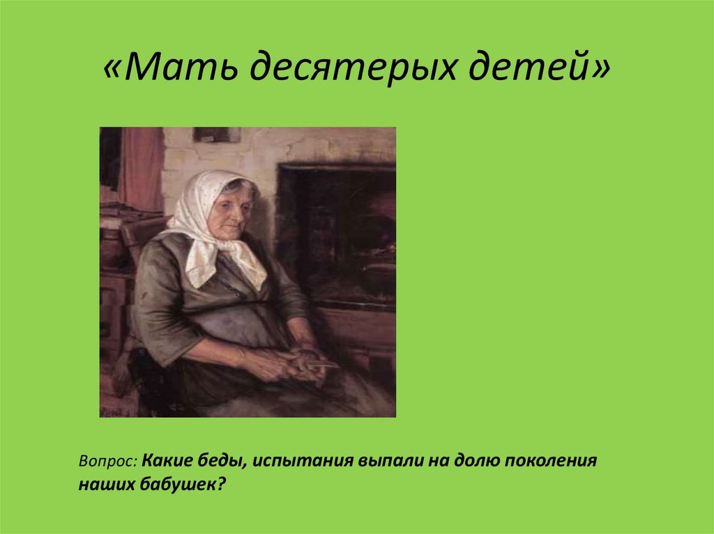 «Мать десятерых детей»Вопрос: Какие беды, испытания выпали на долю поколения