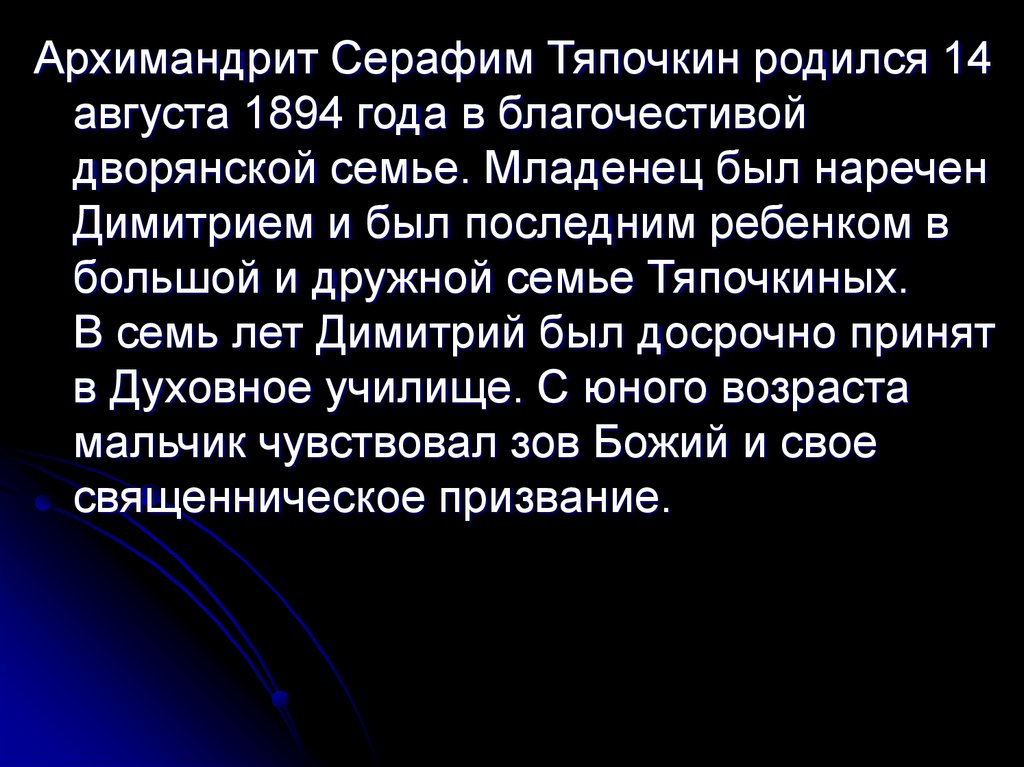 Архимандрит Серафим Тяпочкин родился 14августа 1894 года в благочестивой