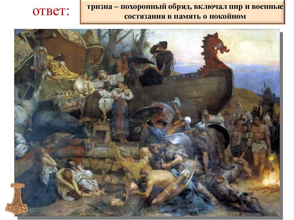 ответ:тризна – похоронный обряд, включал пир и военные