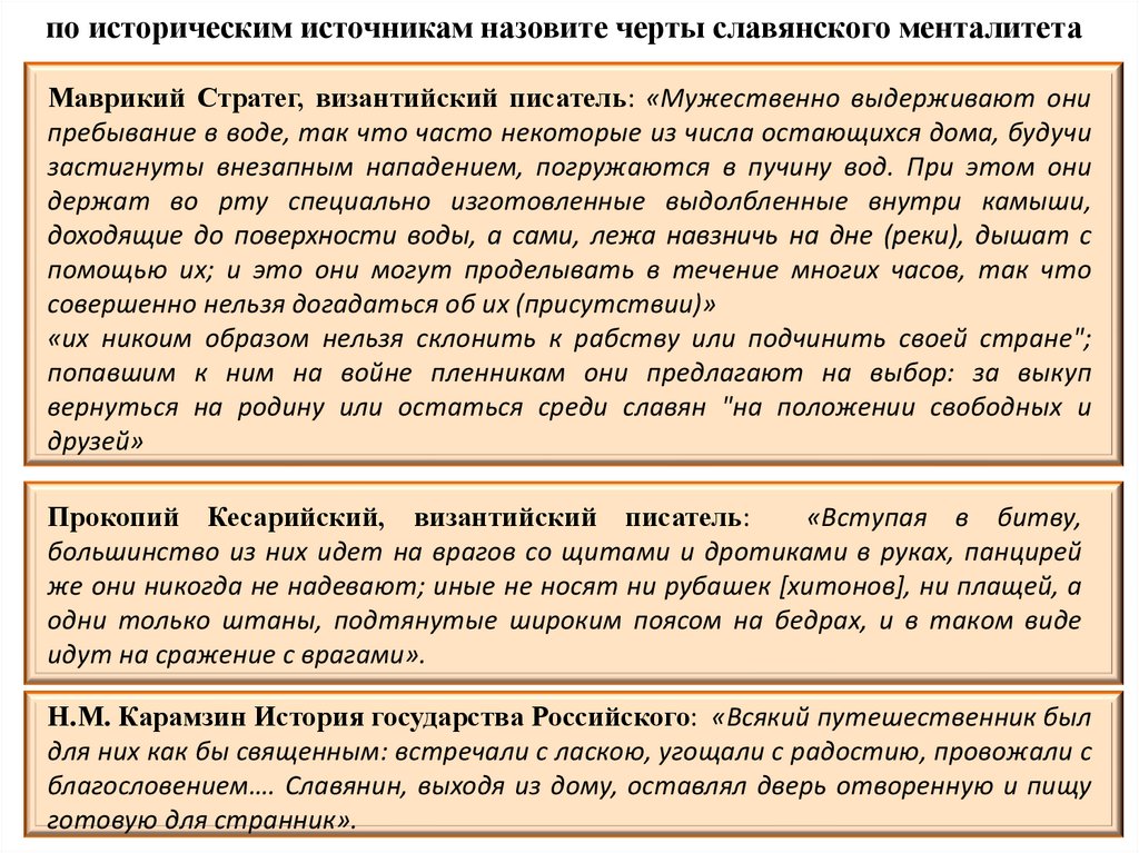 по историческим источникам назовите черты славянского менталитетаМаврикий Стратег, византийский писатель: «Мужественно выдерживают они