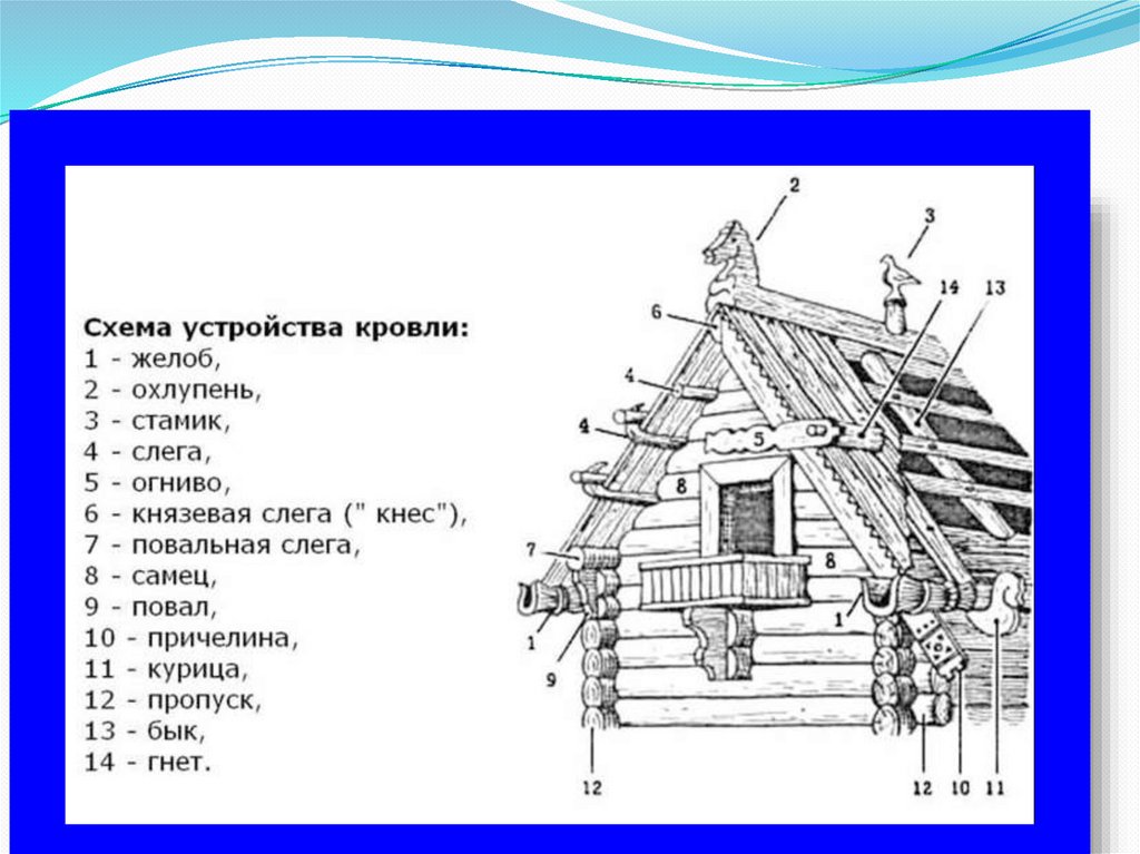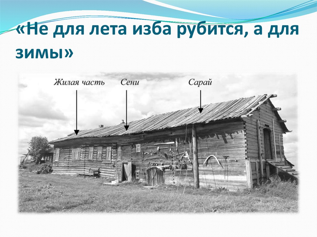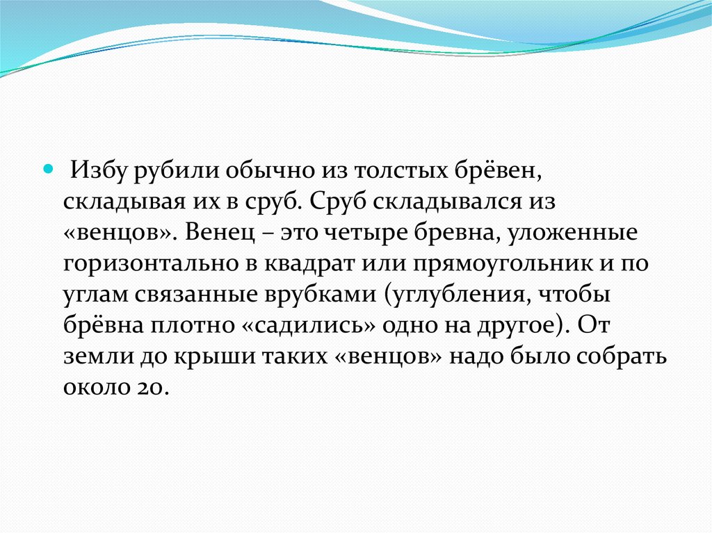 Избу рубили обычно из толстых брёвен,складывая их в сруб. Сруб складывался из