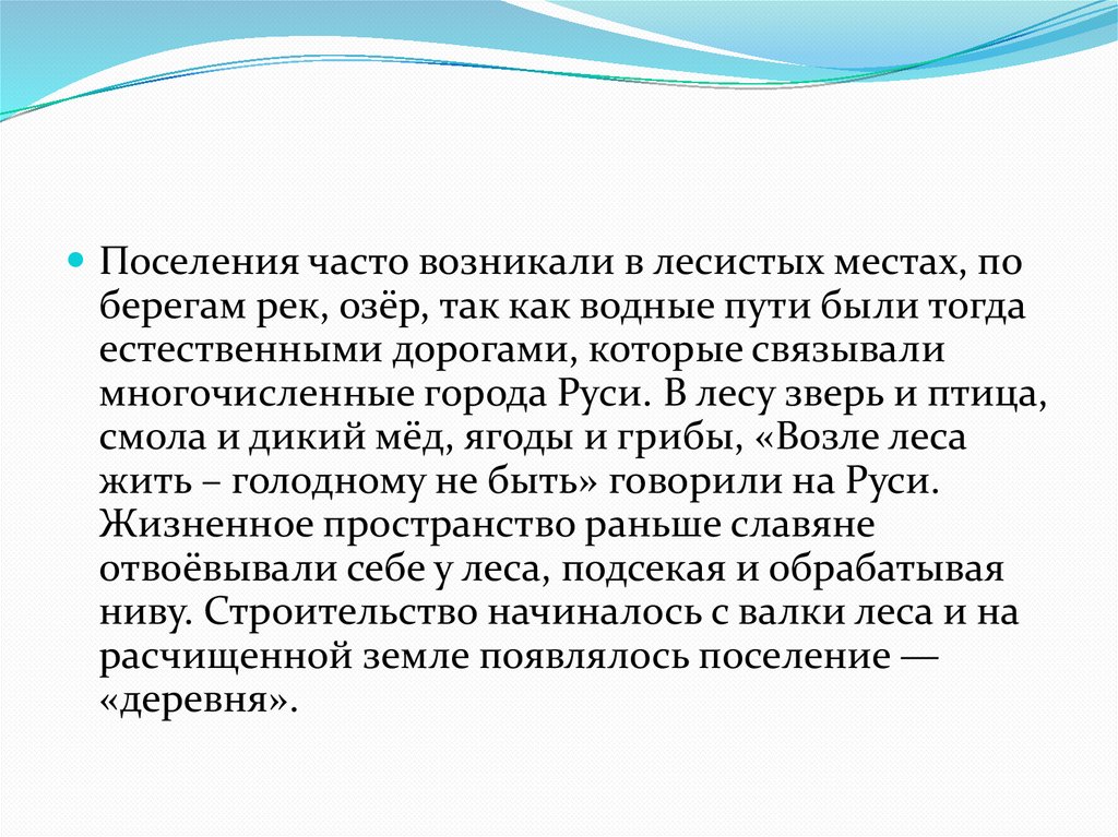 Поселения часто возникали в лесистых местах, поберегам рек, озёр, так как водные пути были тогда
