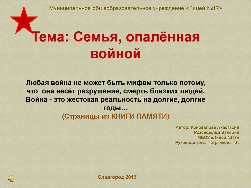 Муниципальное общеобразовательное учреждение «Лицей №17»Тема: Семья, опалённая