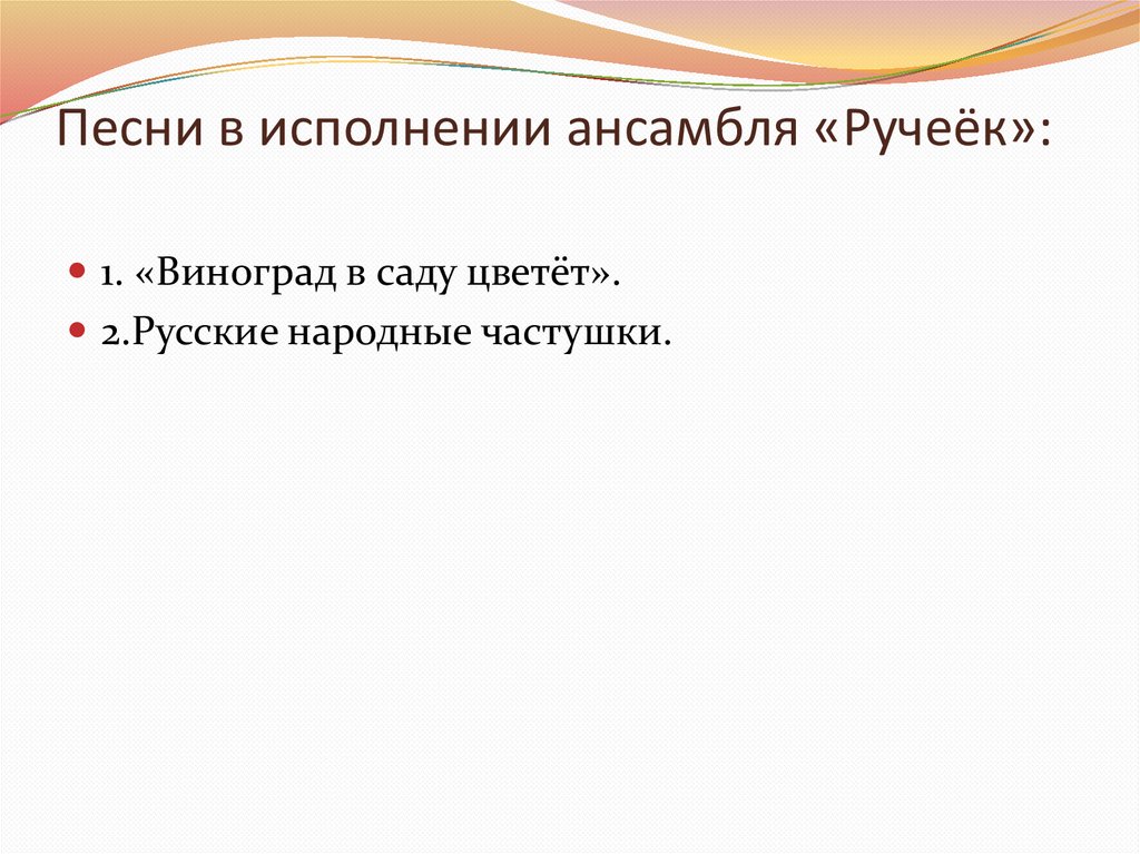 Песни в исполнении ансамбля «Ручеёк»:1. «Виноград в саду цветёт».