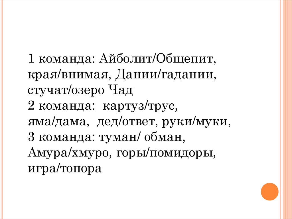 1 команда: Айболит/Общепит,края/внимая, Дании/гадании,
