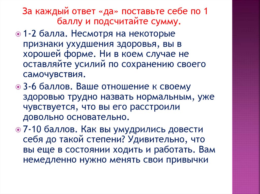 За каждый ответ «да» поставьте себе по 1баллу и подсчитайте сумму.