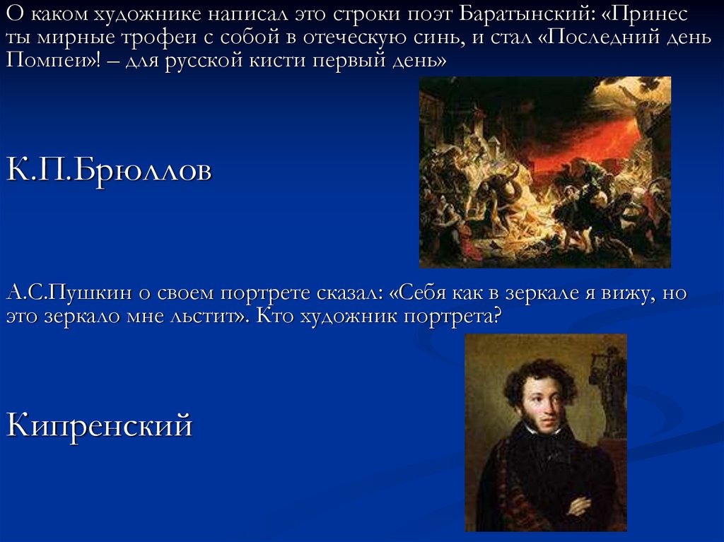 О каком художнике написал это строки поэт Баратынский: «Принесты мирные трофеи с собой в отеческую синь, и стал «Последний день