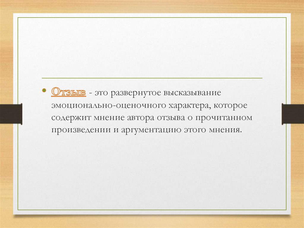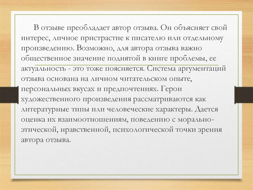 В отзыве преобладает автор отзыва. Он объясняет свойинтерес, личное пристрастие к писателю или отдельному