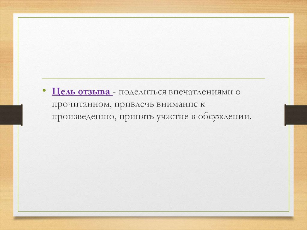 • Цель отзыва - поделиться впечатлениями опрочитанном, привлечь внимание к