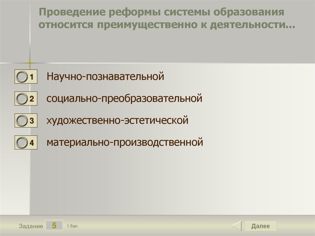 Проведение реформы системы образованияотносится преимущественно к деятельности...