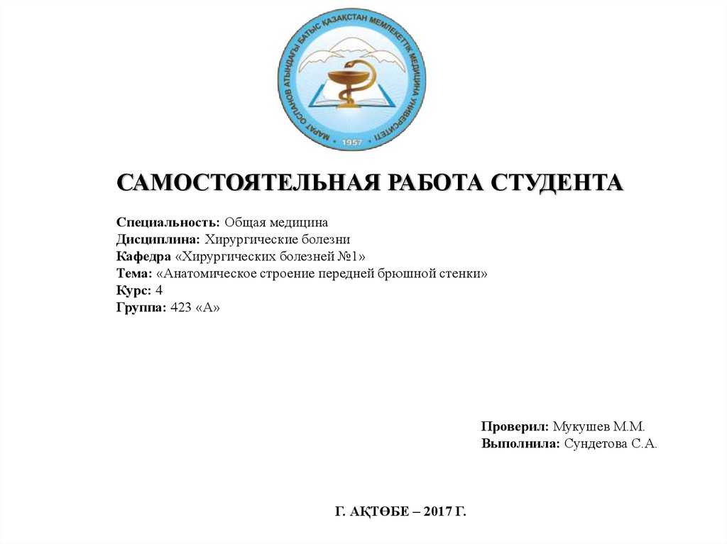 САМОСТОЯТЕЛЬНАЯ РАБОТА СТУДЕНТАСпециальность: Общая медицина
