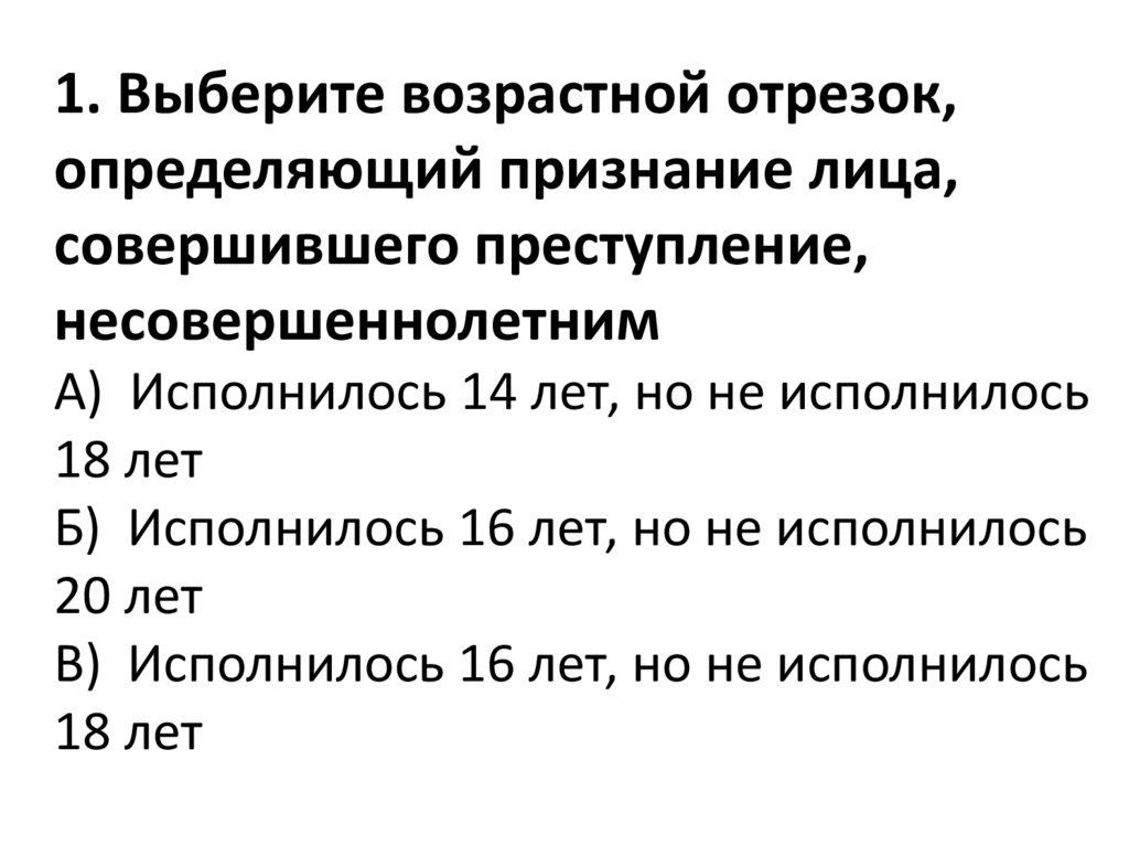 1. Выберите возрастной отрезок,определяющий признание лица,