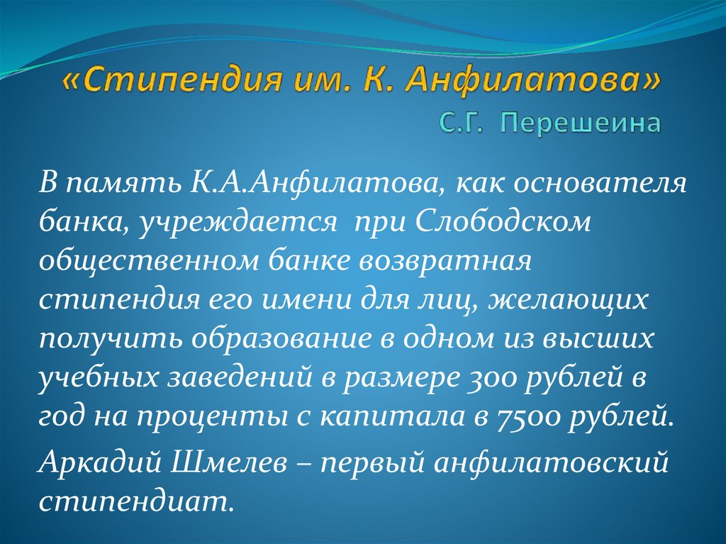 В память К.А.Анфилатова, как основателябанка, учреждается при Слободском