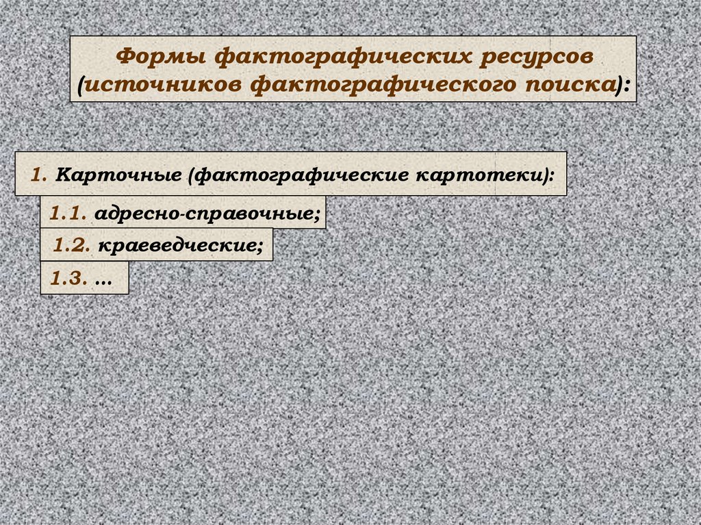 1. Карточные (фактографические картотеки):