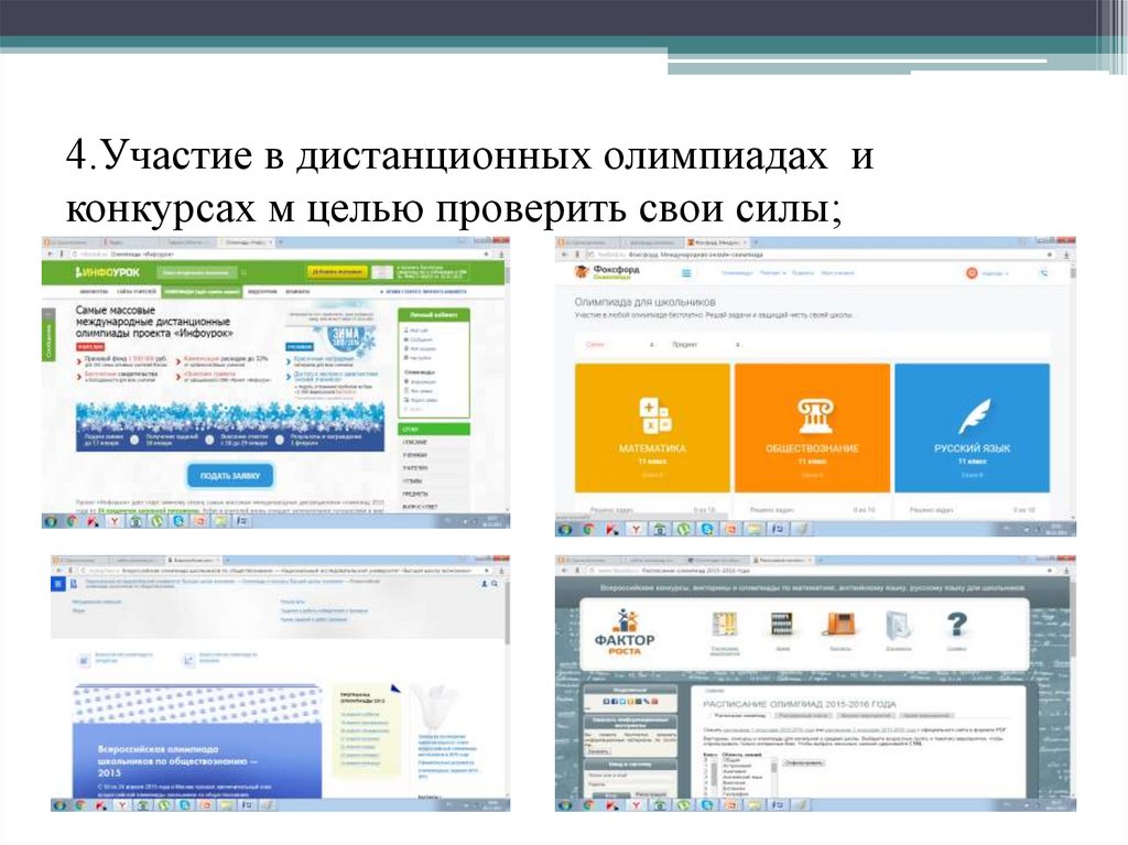 4.Участие в дистанционных олимпиадах иконкурсах м целью проверить свои силы;