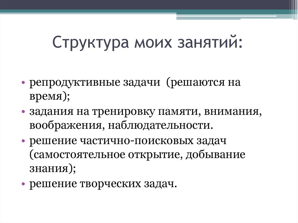 Структура моих занятий:• репродуктивные задачи (решаются на