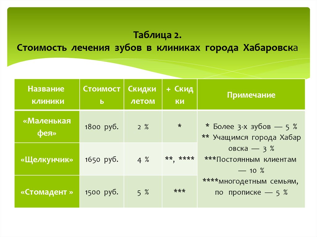 Таблица 2.Стоимость лечения зубов в клиниках города Хабаровска