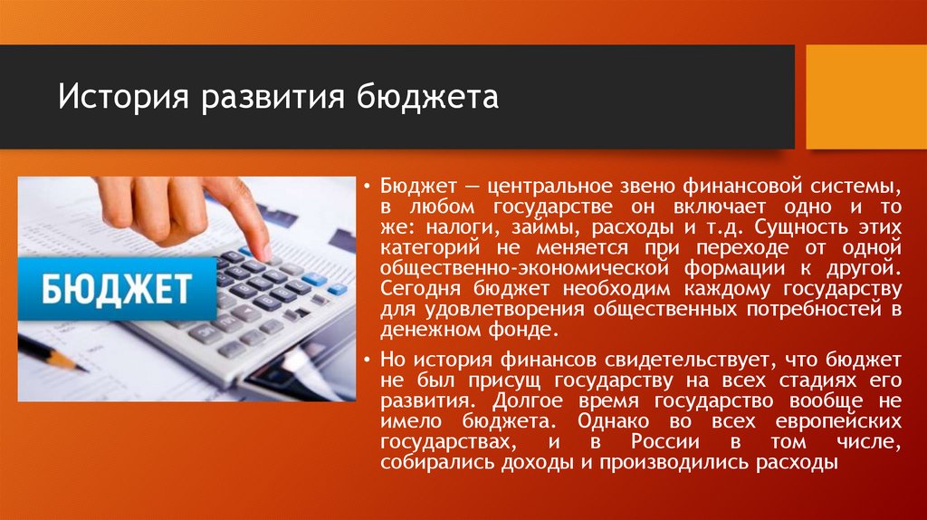 История развития бюджета• Бюджет — центральное звено финансовой системы,