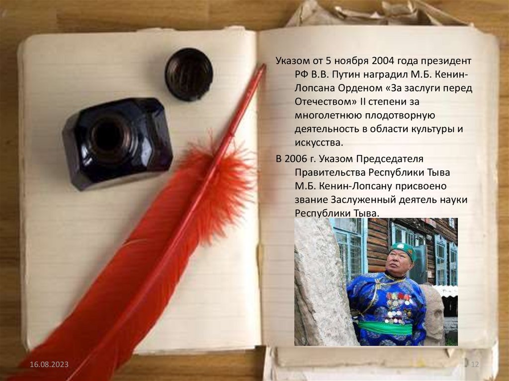 Указом от 5 ноября 2004 года президентРФ В.В. Путин наградил М.Б. КенинЛопсана Орденом «За заслуги перед