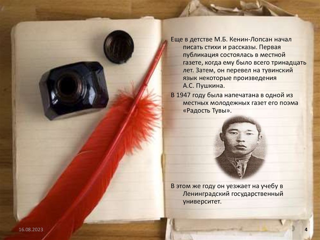 Еще в детстве М.Б. Кенин-Лопсан началписать стихи и рассказы. Первая