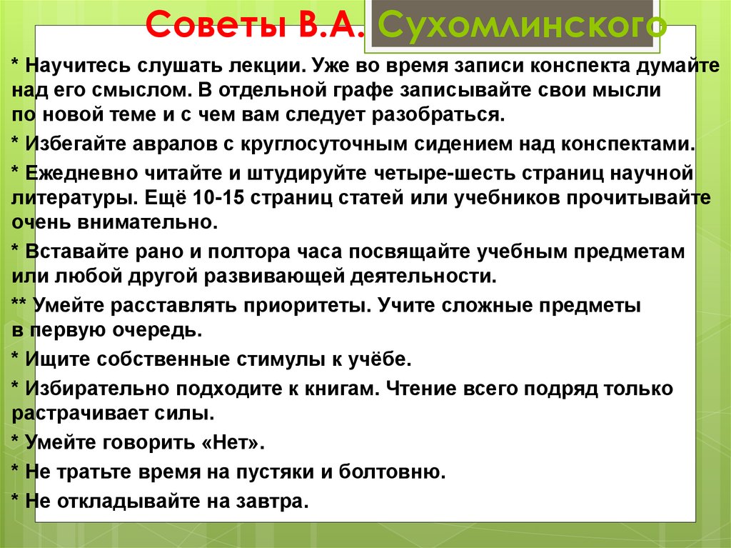 Советы В.А. Сухомлинского* Научитесь слушать лекции. Уже во время записи конспекта думайте
