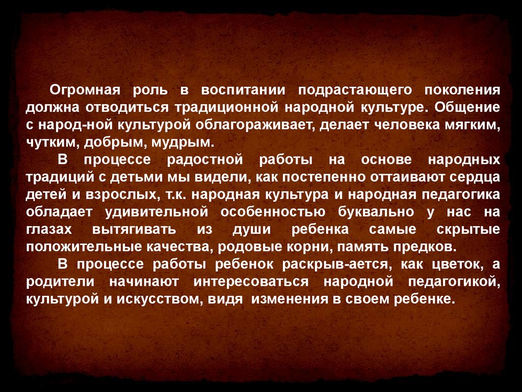 Огромная роль в воспитании подрастающего поколениядолжна отводиться традиционной народной культуре. Общение